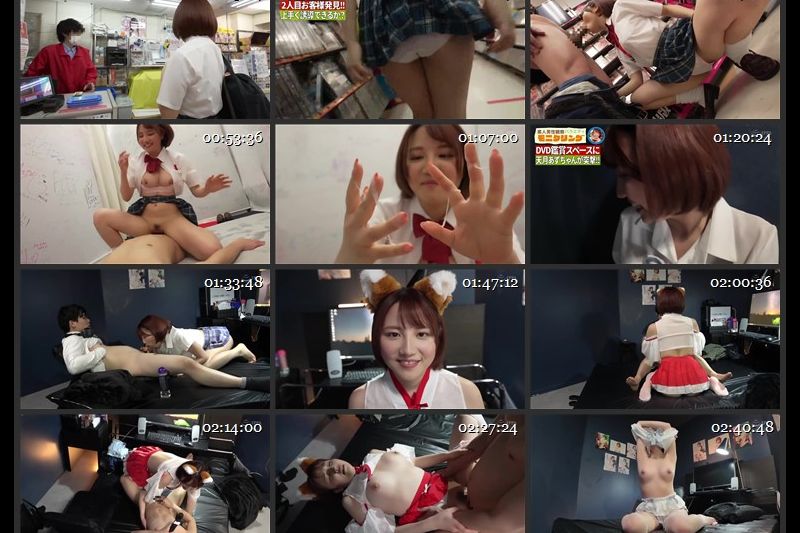 元気ハツラツ制服美少女天月あずがDVDショップに大潜入!ショップ内を徘徊するとおもちゃグッズを见つけて店员さんにパンチラおっぱい见せておねだりすると无料でゲット!お店にいるお客様に声挂けするとびっくりして逃げられちゃう!意気消沈しながらも次のターゲットを见つけて声挂け开始!DVD商品の前でそのまま即フェラ!そのままイベントスペースに移动してAV女优と梦のエッチ!店员さんや他のお客様に见学されながらも生中出しSEXでフィニッシュ!次のターゲットを狙おうとしたら、お店でのSEXがSNSで拡散されてまさかの撮影NG!急遽DVDボックスに移动してセンズリコキ始めた兴奋して勃起してるお客様を突撃!オナニーグッズを駆使してエッチする前に暴発発射!次は部屋に待机してお客様を待つ展开に!訳も分からずなすがままのお客様にあずちゃんが积极プレイ!兴奋してそのまま暴発中出し!最后は视聴ユーザーにオナニープレゼント!